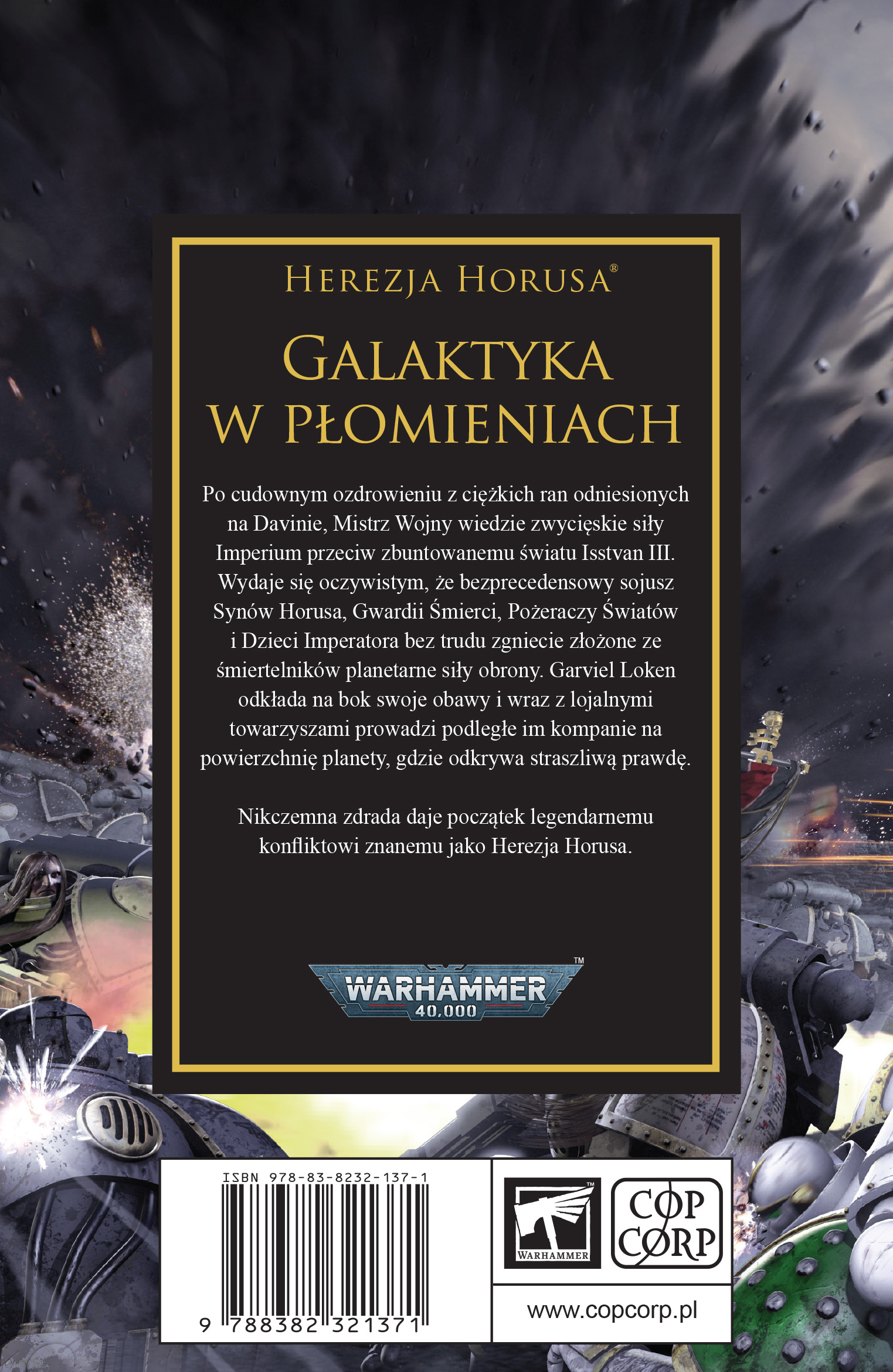 Galaktyka w Płomieniach to trzeci tom sagi Herezja Horusa autorstwa Bena Countera. Powieść przenosi czytelnika wprost na pola bitew Isstvanu III, gdzie imperialne Legiony stają naprzeciw sobą w epickiej zdradzie, która zaczyna największą wojnę domową w dziejach Imperium Człowieka. To tu Herezja Horusa przestaje być intrygą, a staje się otwartą wojną.